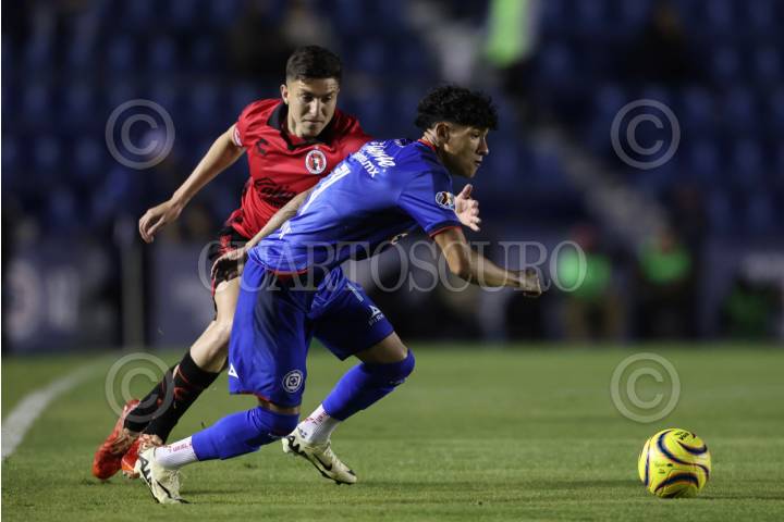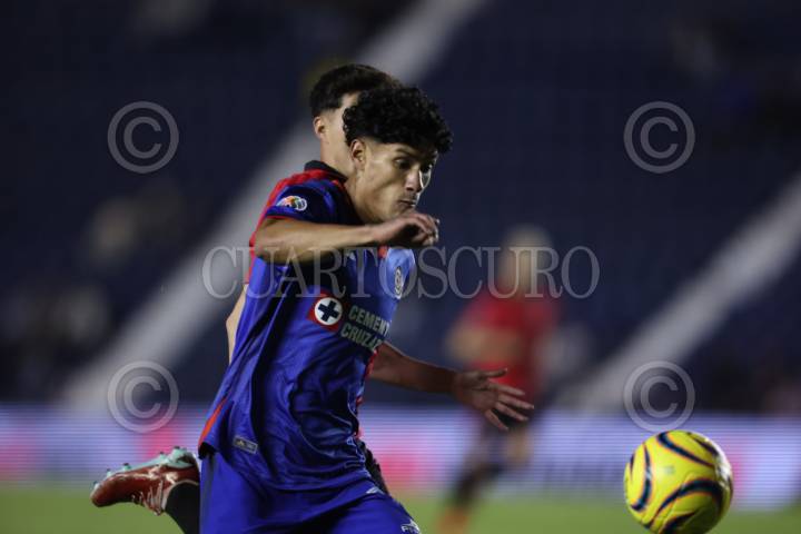 CIUDAD DE MÉXICO, 30ENERO2024. Uriel Antuna de Cruz Azul pelea una pelota durante el partido de fútbol Cruz Azul vs Tijuana correspondiente a la jornada 4 del Torneo Clausura 2024 de Liga BBVA MX, en el Estadio Ciudad de los Deportes. FOTO: EDGAR NEGRETE LIRA/CUARTOSCURO.COM