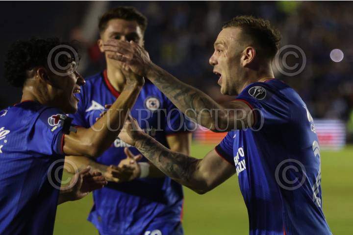 CIUDAD DE MÉXICO, 10FEBRERO2024. Uriel Antuna y Carlos Rotondi festejan una anotación durante el partido de fútbol Cruz Azul vs Atlético San Luis correspondiente a la jornada 6 del Torneo Clausura 2024 de Liga BBVA MX, en el Estadio Ciudad de los Deportes. FOTO: EDGAR NEGRETE LIRA/CUARTOSCURO.COM