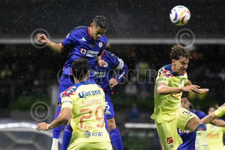 CIUDAD DE MÉXICO, 26MAYO2024.- Uriel Antuna del Cruz Azul remata el balón en el área chica del América, en la imagen se aprecia a Igor Lichnovsky del América. Las Águilas se impusieron 1-0 al Cruz Azul en la final de la Liga MX, con esto los de Coapa se coronan como Bicampeones en el Estadio Azteca. FOTO: MOISÉS PABLO/CUARTOSCURO.COM