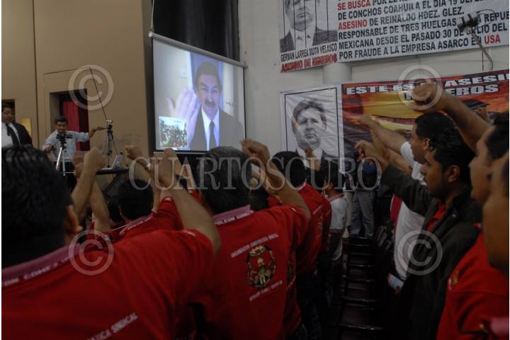MÉXICO, D.F., 19FEBRERO2009.- El líder sindical Napoleón Gómez Urrutia, refugiado en Canadá y cuya extradición fue solicitada por México a ese país, ofreció una videoconferencia para demandar seguridad laboral y recordar la tragedia del yacimiento de Pasta de Conchos, ocurrida hace tres años y la cual le costó la vida a a 65 mineros FOTO: ALBERTO VERA/CUARTOSCURO.COM