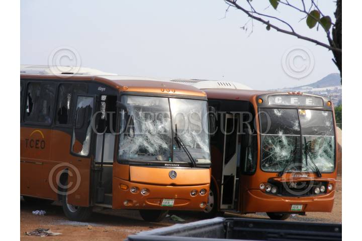 FRESNILLO, ZACATECAS, 10JUNIO2009.- Un grupo de mineros sindicalizados simpatizantes de Napoleón Gómez Urrutia, intentaron bloquear y tomar el complejo minero Fresnillo Peñoles, esto teniendo como resultado una docena de mineros heridos con golpes contusos y fracturas, así como dos autobuses y cuatro camionetas quemadas, es el saldo preliminar que dejó la batalla campal entre unos 400 mineros. FOTO: MARTHA FLORES/CUARTOSCURO.COM