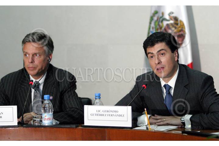 MEXICO, D.F. 13JULIO2005.- John Huntmann, gobernador del estado norteamericano de Utah y el sub secretario de relaciones exteriores Gerónimo Gutierrez Fernández durante la conferencia de prensa conjunta impartida en las instalaciones de la SRE. FOTO: Miguel Dimayuga/CUARTOSCURO.COM