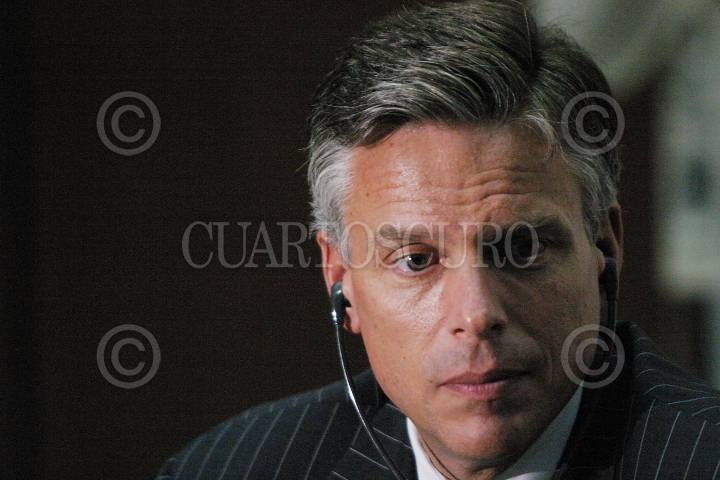 MEXICO, D.F. 13JULIO2005.- John Huntmann, gobernador del estado norteamericano de Utah durante la conferencia de prensa impartida en las instalaciones de la SRE. FOTO: Miguel Dimayuga/CUARTOSCURO.COM