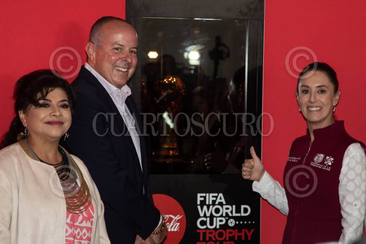 Clara Brugada, alcaldesa de Iztapalapa; Roberto mercade presidente de Coca-Cola México y Caludia Sheinbaum, Jefa de Gobierno durante la inauguración del Tour de la Copa Mundial de la FIFA en la Utopía Meyehualco en Iztapalapa.