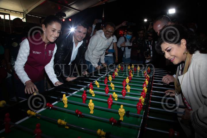 Claudia Sheinbaum juega futbolito con Clara Brugada durante la inauguración del Tour de la Copa Mundial de la FIFA en la Utopía Meyehualco en Iztapalapa.