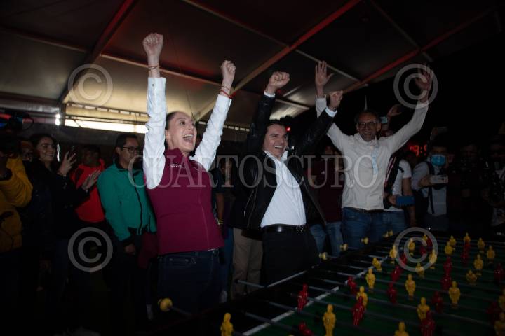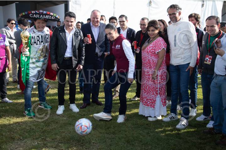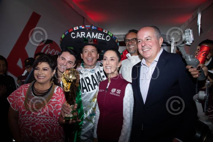 Clara Brugada, Caramelo, Claudia Sheinbaum, Javier Hidalgo y Roberto Mercade durante la inauguración del Tour de la Copa Mundial de la FIFA en la Utopía Meyehualco en Iztapalapa.