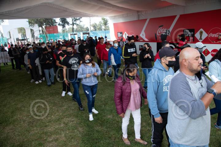 Aficionados hacen fila para entrar a la inauguración del Tour de la Copa Mundial de la FIFA en la Utopía Meyehualco en Iztapalapa.