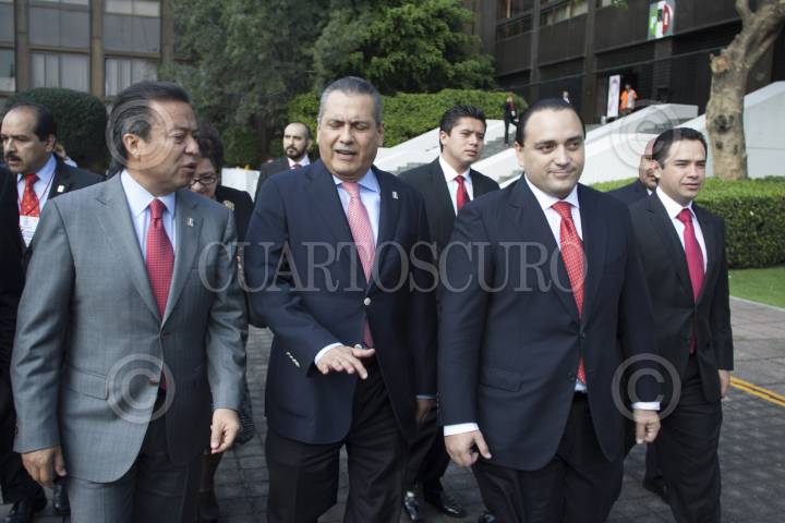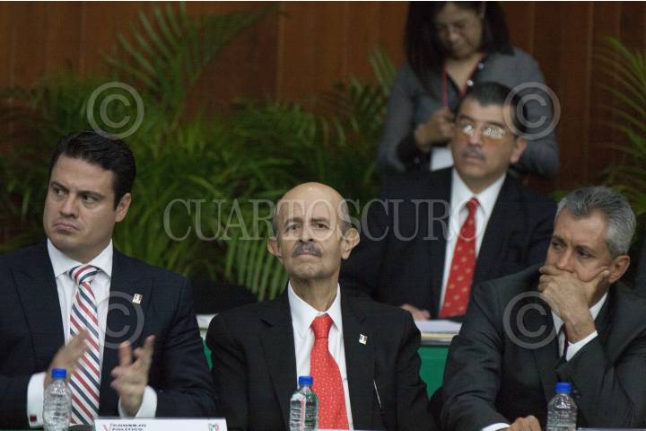 MÉXICO, D.F., 23NOVIEMBRE2013.- Los gobernadores Miguel Alonso Raya, Zacatecas, Rolando Zapata Bello, Yucataán, Egidio Torre Cantú, Tamaulipas y Fernando Toranzo Fernández, San Luis Potosí, durante la sesión de trabajo del V Consejo Político Nacional en la sede nacional del PRI. FOTO: MOISÉS PABLO /CUARTOSCURO.COM