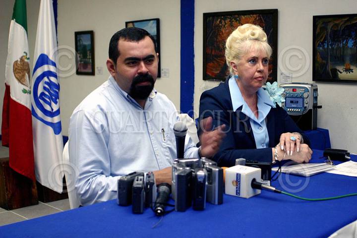 VILLAHERMOSA, TABASCO,21 JUNIO2005.- Francisco Macossay Gonzalez dirigente estatal del Partido Acción Nacional (PAN), acompañado de Gloria Vázquez Secretaria de Comunicación del comité directivo estatal del partido; ofrecio una rueda de prensa en las instalaciones de dicho partido, donde informo del mal actuar de la Comisión Federal de Electricidad al cortar el suministro electrico a los habitantes de villa Tamulte de las Sabanas. FOTO: Marco Polo Guzman/CUARTOSCURO.COM