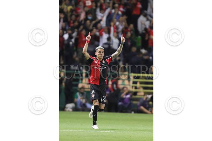 Luis Ricardo Reyes del Atlas festeja su anotación ante el León, en el partido de ida de la final del Torneo Grita México A21.