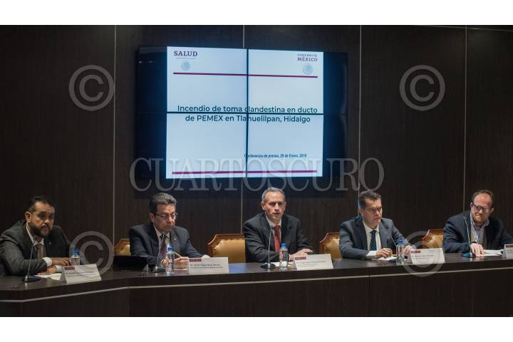 CIUDAD DE MÉXICO, 29ENERO2019.- Rodolfo Lehman Mendoza, subdirector de Servicios de Salud de Pemex; Víctor Hugo Borja, director de Prestaciones Médica del IMSS; Hugo López Gatell, subsecretario de Prevención y Promoción de la Salud; Ramiro López Elizalde, director Médico del ISSSTE, y Ruy López Ridaura, director general del CENAPRECE, ofrecieron conferencia de prensa para informar sobre el balance de la atención médica a los heridos por la explosión en Tlahuelilpan, Hidalgo, el cual indica que 117 personas perdieron la vida además se explicó que dio por finalizada la emergencia sanitaria por explosión de ducto. FOTO: MARIO JASSO /CUARTOSCURO.COM