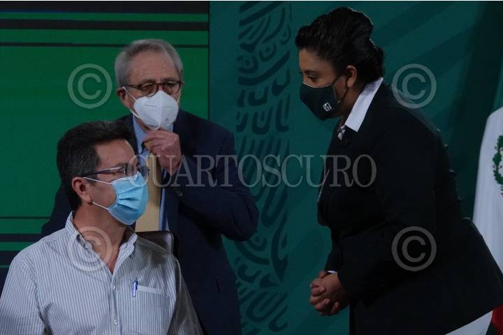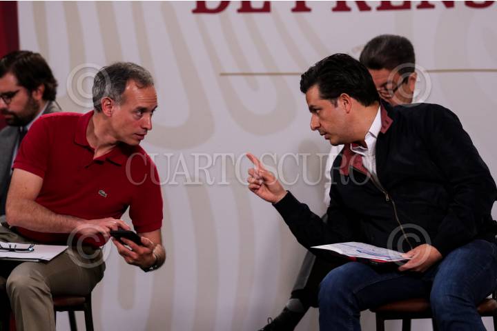 Jorge Alcocer, secretario de Salud, y Alejandro Svarch Pérez, titular de la Coordinación Nacional Médica, durante la conferencia sabatina.