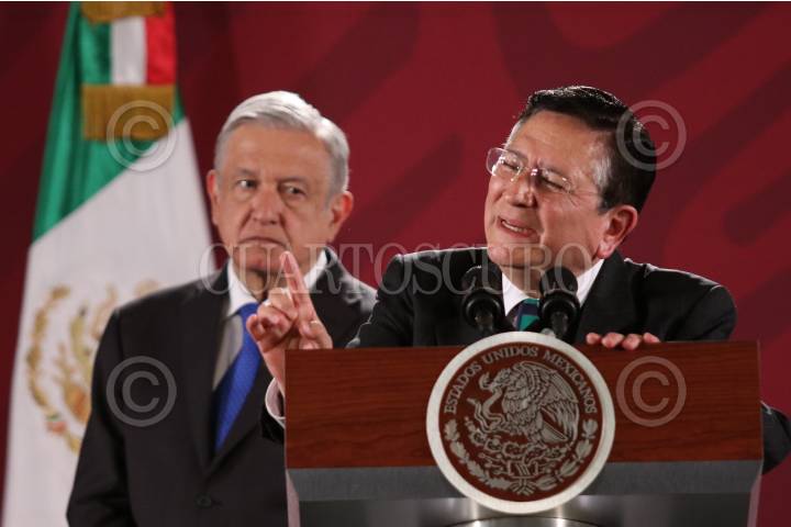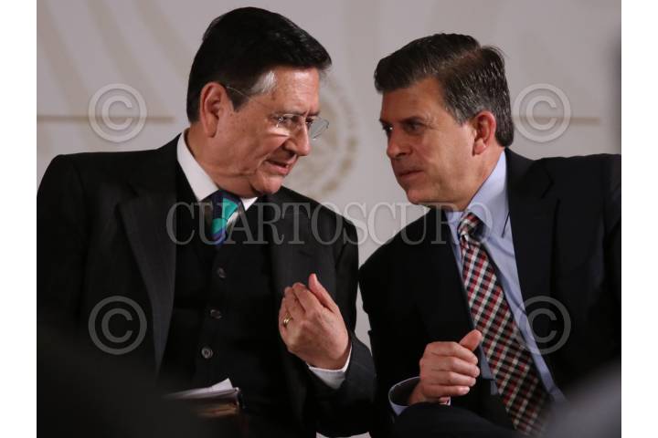 CIUDAD DE MÉXICO, 30SEPTIEMBRE2019.- Víctor Villalobos Arámbula, secretario de Agricultura y Desarrollo Rural (Sader), e Ignacio Ovalle Fernández, director general del organismo Seguridad Alimentaria Mexicana (Segalmex), durante la conferencia matutina donde informó sobre los apoyos al sector agrícola. FOTO: GALO CAÑAS /CUARTOSCURO.COM