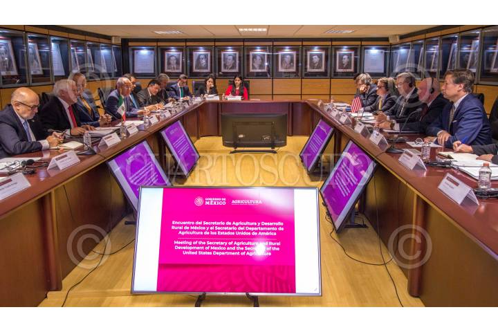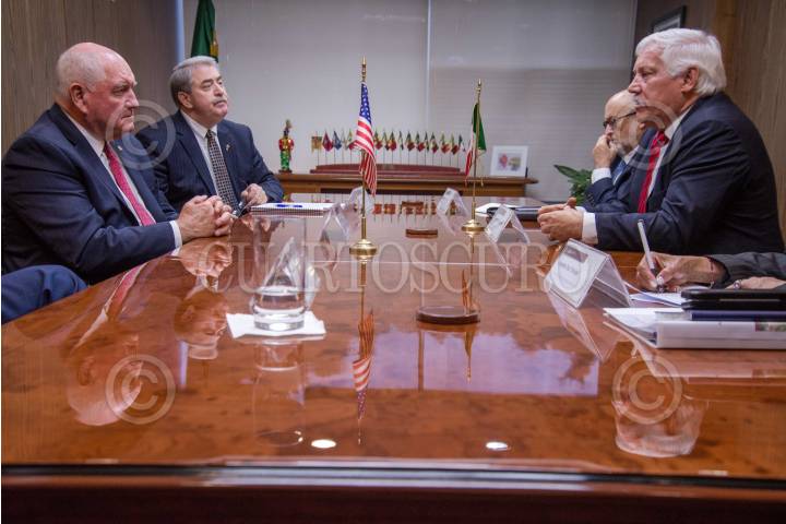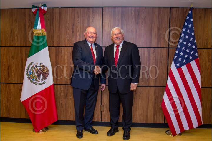 CIUDAD DE MÉXICO, 06NOVIEMBRE2019.- Víctor Villalobos Arámbula, Secretario de Agricultura y Desarrollo Rural, y Sonny Perdue, secretario del Departamento de Agricultura de los Estados Unidos de América, durante la reunión bilateral en la que reafirmaron su compromiso de colaboración a favor del fortalecimiento de una relación comercial agroalimentaria complementaria. FOTO: SADER /CUARTOSCURO.COM