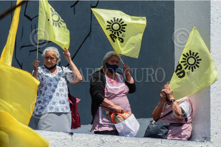 Mujeres simpatizantes del PRD durante el mitin político de Alejandra del Moral, candidata a la gubernatura del Estado de México, por la coalición “Va por el Estado de México” realizado en la explanada del Palacio Municipal de Naucalpan.