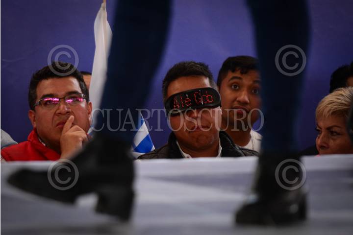 Un simpatizante porta un visor de luces con la frase "Ale Gob" durante el mitin político de Alejandra del Moral, candidata a la gubernatura del Estado de México, por la coalición “Va por el Estado de México” realizado en la explanada del Palacio Municipal de Naucalpan.