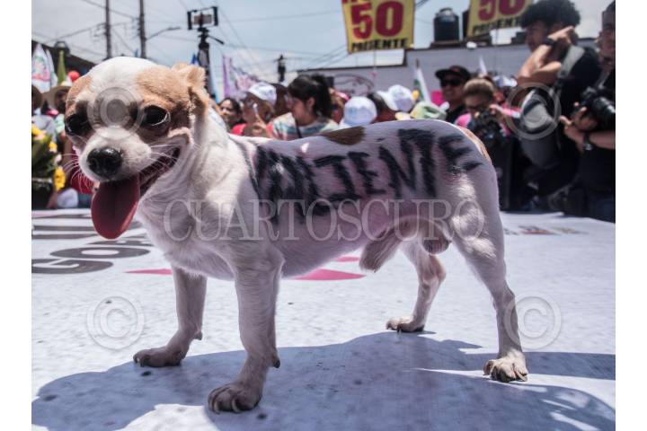 Un canino con la palabra "valiente" durante el mitin político de Alejandra del Moral, candidata a la gubernatura del Estado de México por la coalición PRI, PAN y PRD “Va por el Estado de México en la colonia Ayotla en Ixtapaluca.