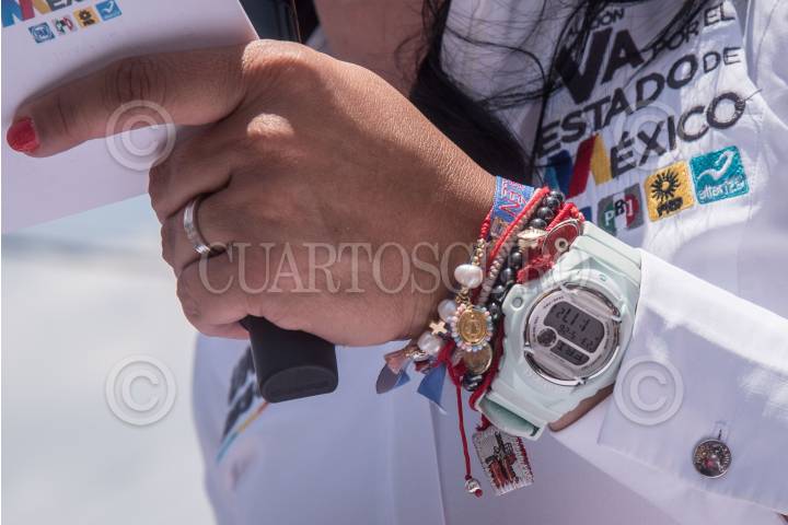 Pulseras, amuletos y reloj que porta Alejandra del Moral, candidata a la gubernatura del Estado de México por la coalición PRI, PAN y PRD “Va por el Estado de México” durante su gira de campaña junto a simpatizantes y vecinos de la colonia Ayotla en Ixtapaluca.