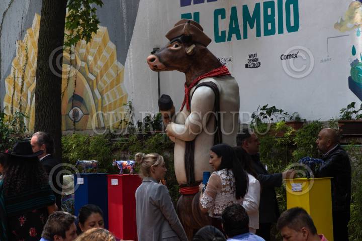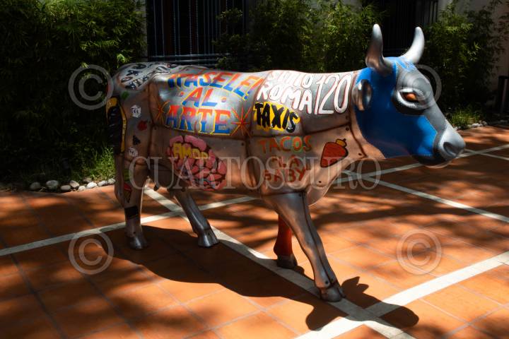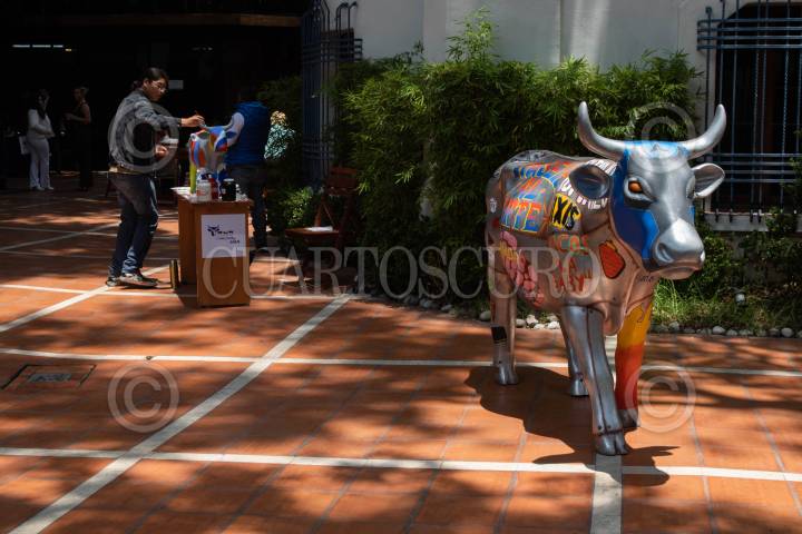 Una de las vacas intervenida para el Cow Parade 2023, inspirada en Mario Moreno Cantinflas.