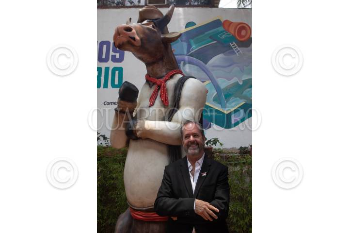 Paul Zarkin, presidente de CowParade México, posa con una de las piezas que formarán la muestra que estará a partir del 23 de julio en Reforma.