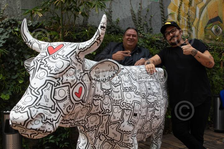 Mario Soto, director general de CowParade México, y Yesterman, artista de CowParade México, posan con la pieza que fue intervenida por el último, durante la presentación del Cow Parade 2023.