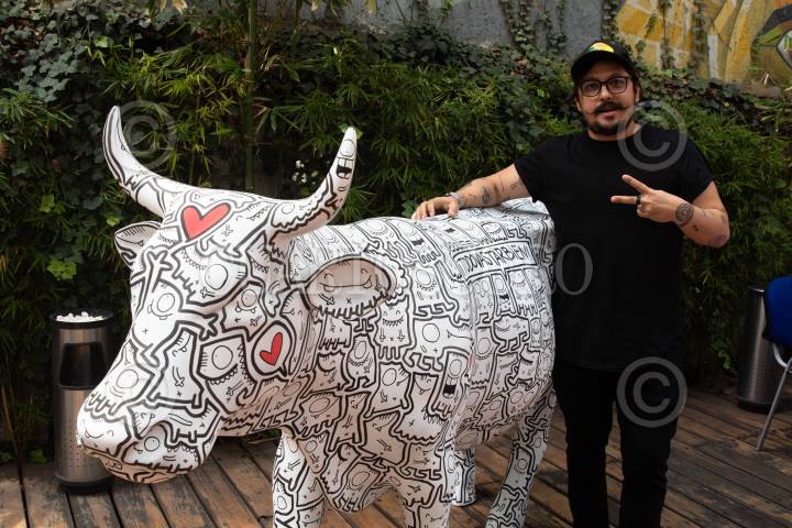 El artista Yesterman posa con su pieza con la cual participará en la Cow Parade 2023.