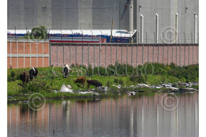 LERMA, ESTADO DE MÉXICO, 09AGOSTO2024.- Algunas vacas pastorean en la parte trasera de la zona industrial de Lerma, tomando agua a la orilla de una pequeña laguna que tiene basura. FOTO: CRISANTA ESPINOSA AGUILAR /CUARTOSCURO.COM