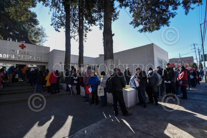 TOLUCA, ESTADO DE MÉXICO, 28DICIEMBRE2023.- Desde temprana hora llegaron personas a formarse a la Cruz Roja Delegación Toluca para poderse aplicar la vacuna contra COVID-19 de Pfizer, en esta ocasión solo llegaron 100 dosis del biológico pero en las siguientes horas esperan la llegada de más, la vacuna será aplicada también en las delegaciones de Naucalpan, Cuautitlán México, Lilas, Hospital Central de Polanco. FOTO: CRISANTA ESPINOSA AGUILAR /CUARTOSCURO.COM