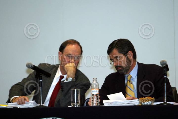 MEXICO, D.F. 12NOVIEMBRE2004.- Enrique del Val conversa con Juan Ramón de la Fuente, rector de UNAM, durante la sesión del consejo universitario que se realizó en el Ex- Palacio de Medicina. FOTO: Nelly Salas/CUARTOSCURO.COM
