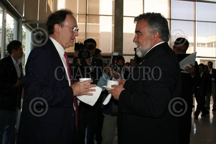 MÉXICO, D.F. 28NOVIEMBRE2006.- Alejandro Encinas, jefe de gobierno capitalino acudió a conclusión de trabajos de reordenamiento Inmobiliario de las Sedes de la Secrearía de Relaciones Exteriores en Tlatelolco. En la imagen, Enrique del Val, secretario general de la UNAM FOTO: PAOLA HIDALGO/CUARTOSCURO.COM