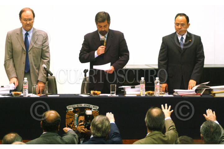 MÉXICO D.F. 09MARZO2007.- De izquierda a derecha Enrique del Val, secretario general, el rector Juan Ramón de la Fuente y Jorge Islas López, secretario de servicios a la comunidad universitaria, felicitan a los nuevos integrantes del Consejo Universitario. FOTO: JEFTÉ ARGUELLO/CUARTOSCURO.COM