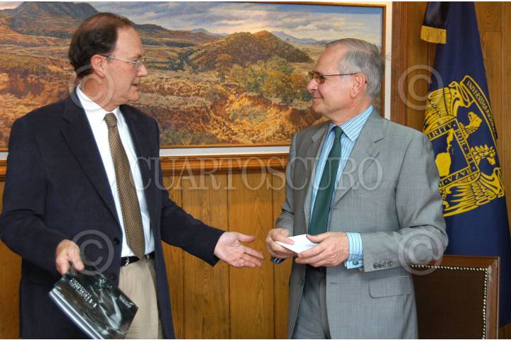 MEXICO, D.F. 21FEBRERO2006.- El secretario general de la UNAM, Enrique del Val y Gerard Fontaine, funcionario de la Embajada de Francia en México, durante la renovación de un convenio de colaboración académica, científica y cultura entre ambas instituciones. FOTO? UNANM/CUARTOSCURO.COM