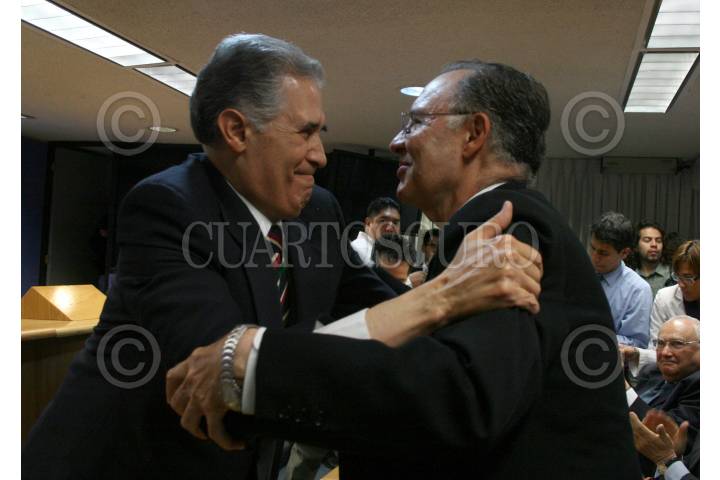 MÉXICO,D,F.,09OCTUBRE2007.- Sergio Ramirez Ex procurador, felicita a Diego Valadez, candidato a la rectoria de la UNAM al termino de la conferencia que ofreció en donde, menciono las razones por los que aspira a la rectoria. FOTO:SASHENKA GUTIERREZ/CUARTOSCURO.COM