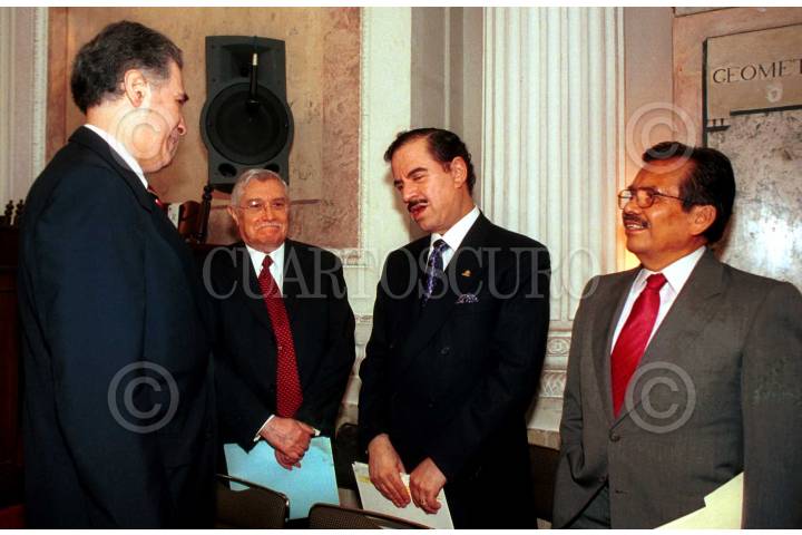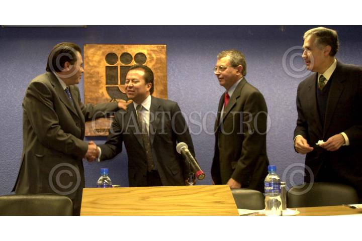 México D.F. 03 FEBRERO 2004.- Los diputados René Arce (PRD), César Camacho (PRI), Manuel Camacho Solis y Diego Valadéz quien fue el moderador del seminario donde el tema fue "Bobbio en la teoria del derecho y en la práctica de la política" que se realizó en el Instituto de Investigaciones Jurídicas de la UNAM. FOTO: Sandra Perdomo/CUARTOSCURO.COM
