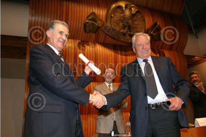 MEXICO, D.F., 26ABRIL2006.- Jesús Blancornelas, director del semanario Z de Tijuana, recibió un reconocimiento por su trayectoria por parte de la Cámara de Diputados. En la imagen lo acompaña Diego Valadez, academico de la UNAM. FOTO: Moisés Pablo/CUARTOSCURO.COM