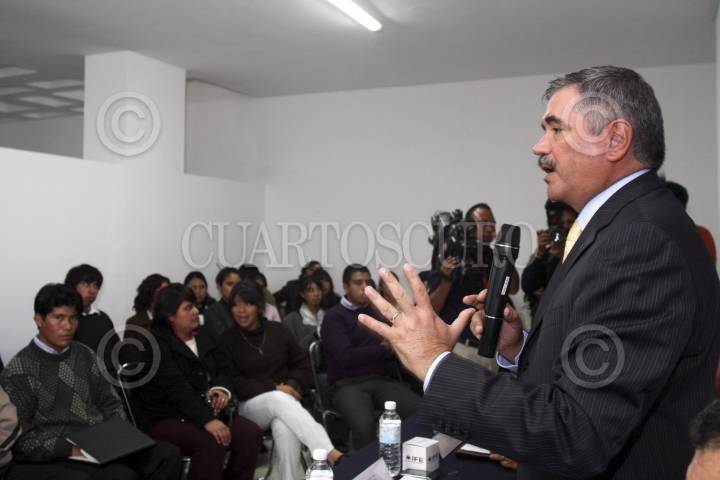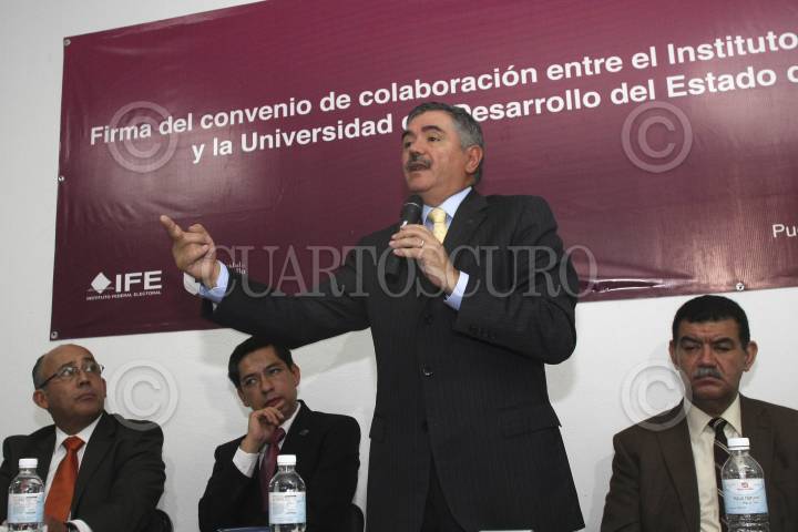 PUEBLA, PUEBLA, 13OCTUBRE2011.- Leonardo Valdés Zurita, consejero presidente del Instituto Federal Electoral (IFE), ofreció una conferencia sobre la histórica del organismo electoral y su importancia en la vida social del país, esto durante la firma de convenio entre el instituto y la Universidad del Desarrollo del Estado de Puebla (UNIDES). FOTO: FRANCISCO GUASCO/CUARTOSCURO.COM