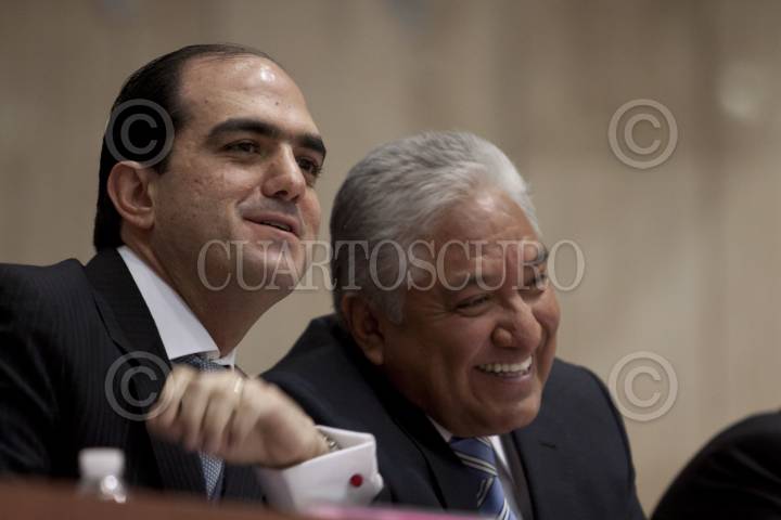 MÉXICO, D.F., 25OCTUBRE2011.- Daniel Karam Toumeh, director general del Instituto Mexicano del Seguro Social (IMSS), conversa con Valdemar Gutierrez Fragoso, titular del Sindicato de Trabajadores del Seguro Social durante la Ceremonia Institucional del Día del Médico que se celebro en la Unidad de Congresos del Centro Médico Nacional Siglo XXI. FOTOS: RODOLFO ANGULO/CUARTOSCURO.COM