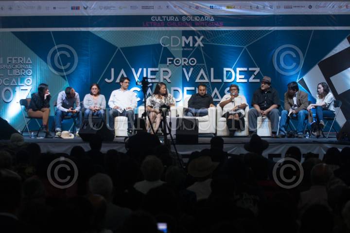 CIUDAD DE MÉXICO, 21OCTUBRE2017.- Periodistas de diversos medios y estados de la República, como Laura Sánchez, Gerardo Romo, Modesto Peralta, Martha Izquierdo, Martín Durán, Carlo Manuel, Maricarmen Aguilar, Dania Martínez, que son parte de la públicación "Romper el Silencio: 22 gritos contra el silencio", presentaron el libro en la Feria Internacional del Libro Zócalo, como parte de un homenaje luctuoso a Javier Valdez, periodista asesinado recientemente en el estado de Sinaloa. FOTO: TERCERO DÍAZ /CUARTOSCURO.COM