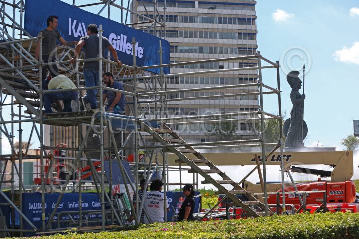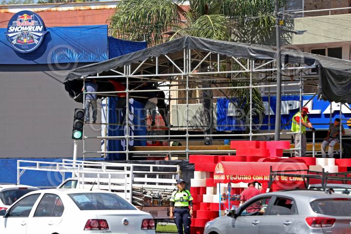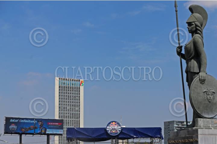 Montaje y detalles de los preparativos en torno de la Glorieta Minerva, en donde se llevara a cabo el evento denominado “Red Bull Show Run 2022”, que consiste en una función encabezada por el Piloto Mexicano Sergio Pérez.