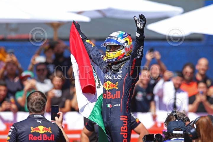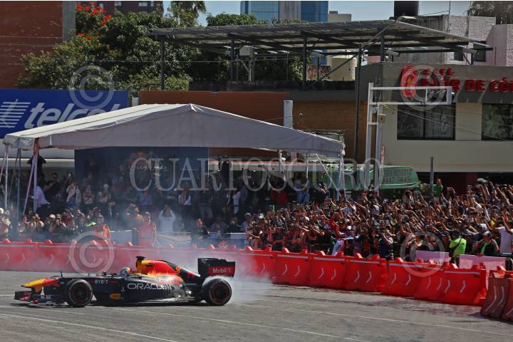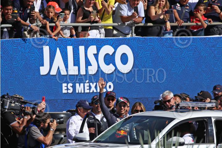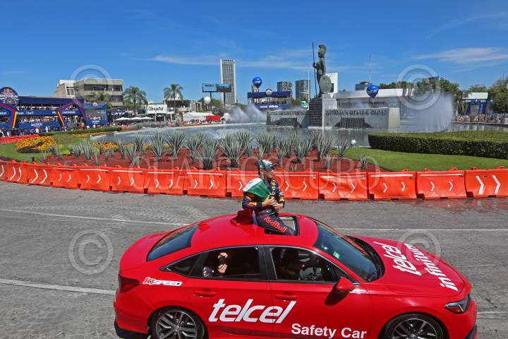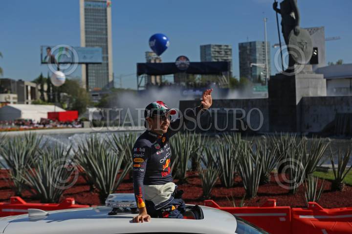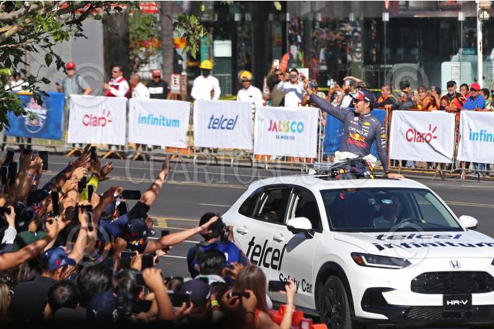 El piloto Tapatío Checo Pérez, realiza un recorrido para despedirse de los asistentes que se dieron cita en las inmediaciones de la Glorieta Minerva, para presenciar el evento denominado “Red Bull Show Run 2022.