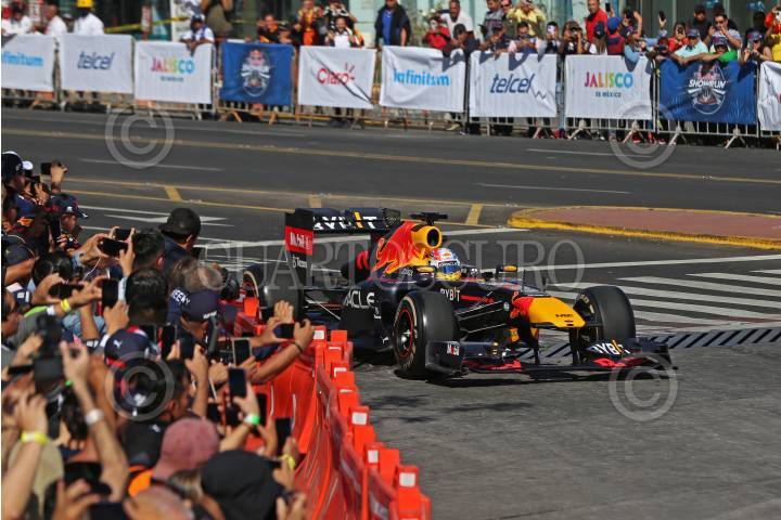 El piloto Tapatío Checo Pérez, durante su exhibición en su automóvil RV7 en las inmediaciones de la Glorieta Minerva, en evento denominado “Red Bull Show Run 2022.