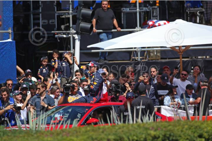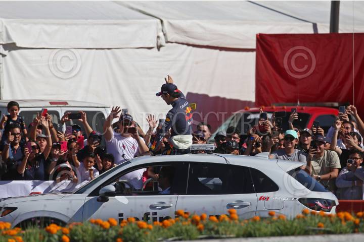 El piloto Tapatío de la Formula 1 Checo Pérez, durante su recorrido de reconocimiento, saluda a los asistente al espectaculo, esto en las inmediaciones de la Glorieta Minerva, en evento denominado “Red Bull Show Run 2022.