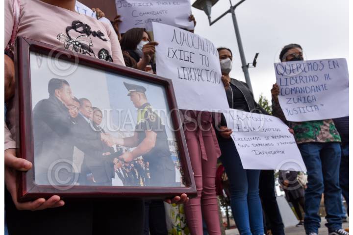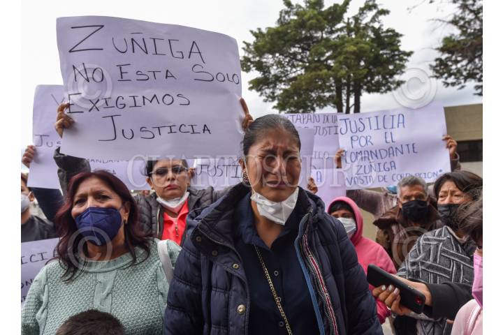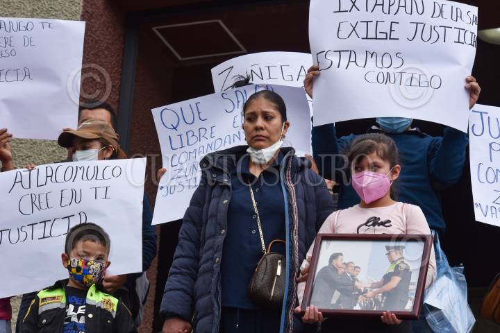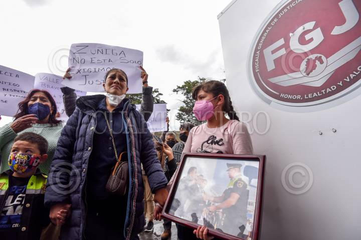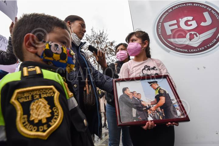 Familiares y compañeros de José Luis “N” comisario de Seguridad Pública Municipal de Valle de Bravo detenido por la FGJEM presuntamente por filtrar información de operativos y actividades oficiales a grupos del narcotráfico, se manifestaron en las instalaciones de la fiscalía mexiquense exigiendo justicia.