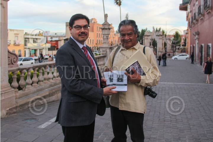 FRESNILLO, ZACATECAS, 03ABRIL2017.- En la Presidencia Municipal de Fresnillo, Alfonso Vázquez Sosa, director general del Instituto Zacatecano de Cultura, presentó el programa del Festival Cultural de este municipio, que en su edición de 2017 estará dedicado a Pedro Valtierra. Aquí, el fotoperiodista habló de su quehacer en la fotografía y de sus inicios en el oficio. FOTO: CUARTOSCURO.COM
