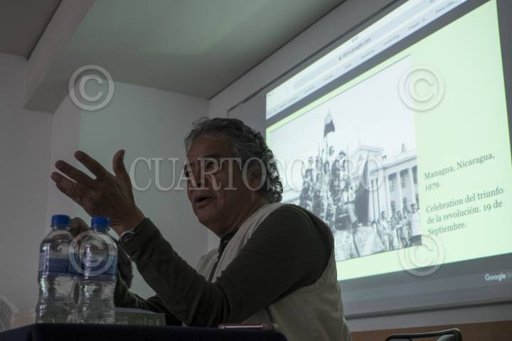 GUATEMALA, GUATEMALA, 07AGOSTO2018.- Pedro Valtierra, director de Cuartoscuro, presentó esta tarde la edición 148 de Cuartoscuro dedicado a los reportajes realizados en 1982 en Guatemala a los grupos revolucionarios, Fuerzas Armadas Rebeldes (FAR) y la Organización Revolucionaria Pueblo en Armas (ORPA) que dirigía Rodrigo Asturias, hijo del premio nobel de literatura Miguel Ángel Asturias, para el periódico unomásuno, que en ese entonces dirigía Manuel Becerra Acosta. La presentación se llevó a cabo en el marco del XIV Congreso Centroamericano de Historia que organiza la Universidad de San Carlos. En la imagen, el poeta Gerardo Guinea Diez. FOTO: LUCIA CUEVAS JIMÉNEZ /CUARTOSCURO.COM