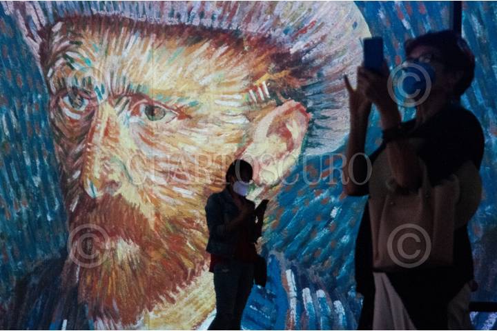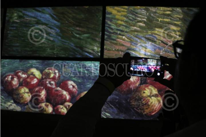 Visitante de la exposición Van Gogh Alive graba con su celular.