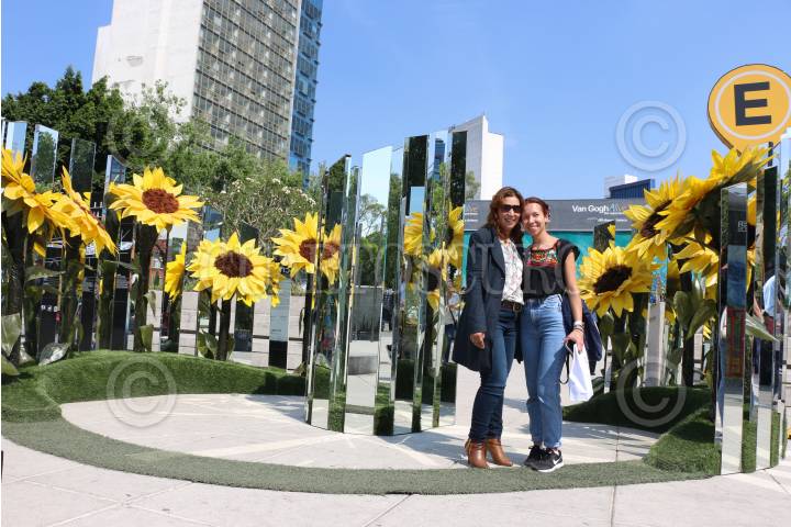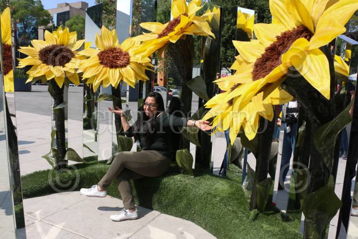 Transeuntes y visitantes de Van Gogh Alive se toman fotografías en el stand de girasoles de dicha exposición, en el Monumento a la Madre.