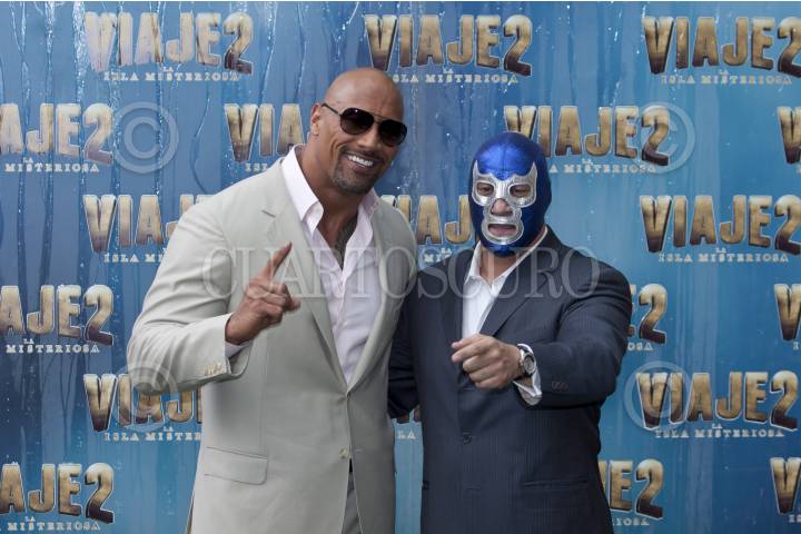 MÉXICO, D.F., 28ENERO2012.- El actor Dwayne Johnson "La Roca" y el luchador Blue Demon Jr. durante la alfombra roja de la película Viaje2 La Isla Misteriosa que se realizó en un cine del Paseo de la Reforma. FOTO: RODOLFO ANGULO/CUARTOSCURO.COM