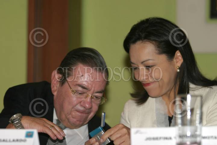 MEXICO, D.F. 16MAYO2005.- Gilberto Rincón Gallardo y Josefina Vazquez Mota, secretaria de Desarrollo Social previo a la presentación de los resultados de la Encuesta Nacional de Discriminación. FOTO: Nelly Salas/CUARTOSCURO.COM