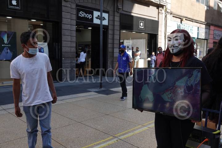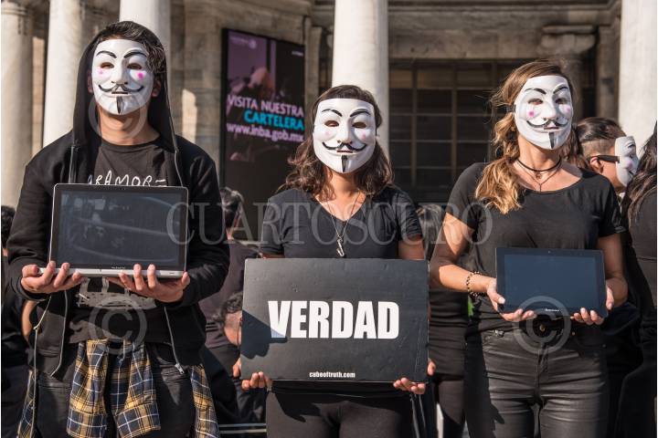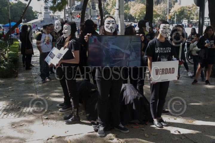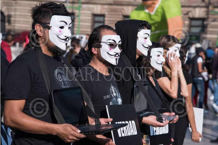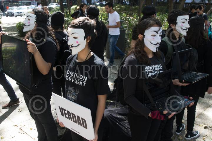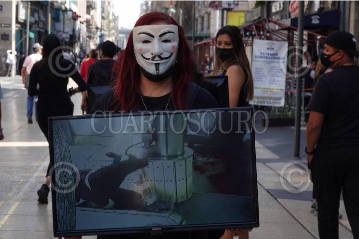 CIUDAD DE MÉXICO, 30DICIEMBRE2018.- El colectivo Anonymus for the Voiceless, un organización por los derechos de los animales quienes se especializan en activismo en la vía pública, se manifestaron sobre la cera de avenida Reforma, con pantallas que muestran videos de como son sacrificados los animales para consumo humano y el trato cruel que reciben por parte de las empresa dedicadas a esta actividad buscan hacer un llamado a la sociedad para que replanteen su hábitos alimenticios. FOTO: MOISÉS PABLO /CUARTOSCURO.COM